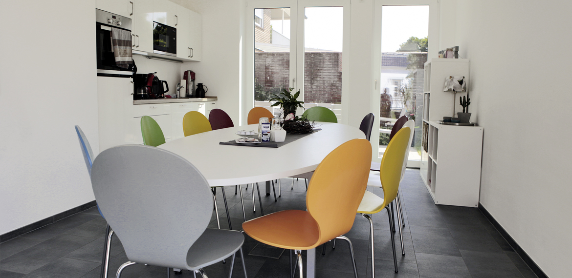 Der offene Baustil mit großen, bodentiefen Fenstern sorgt für helle, lichtdurchflutete Räume. Die Bewohner:innen erhalten seitens der Mitarbeiter:innen der Stiftung die Unterstützung, die sie zu einem selbstbestimmten Leben benötigen.